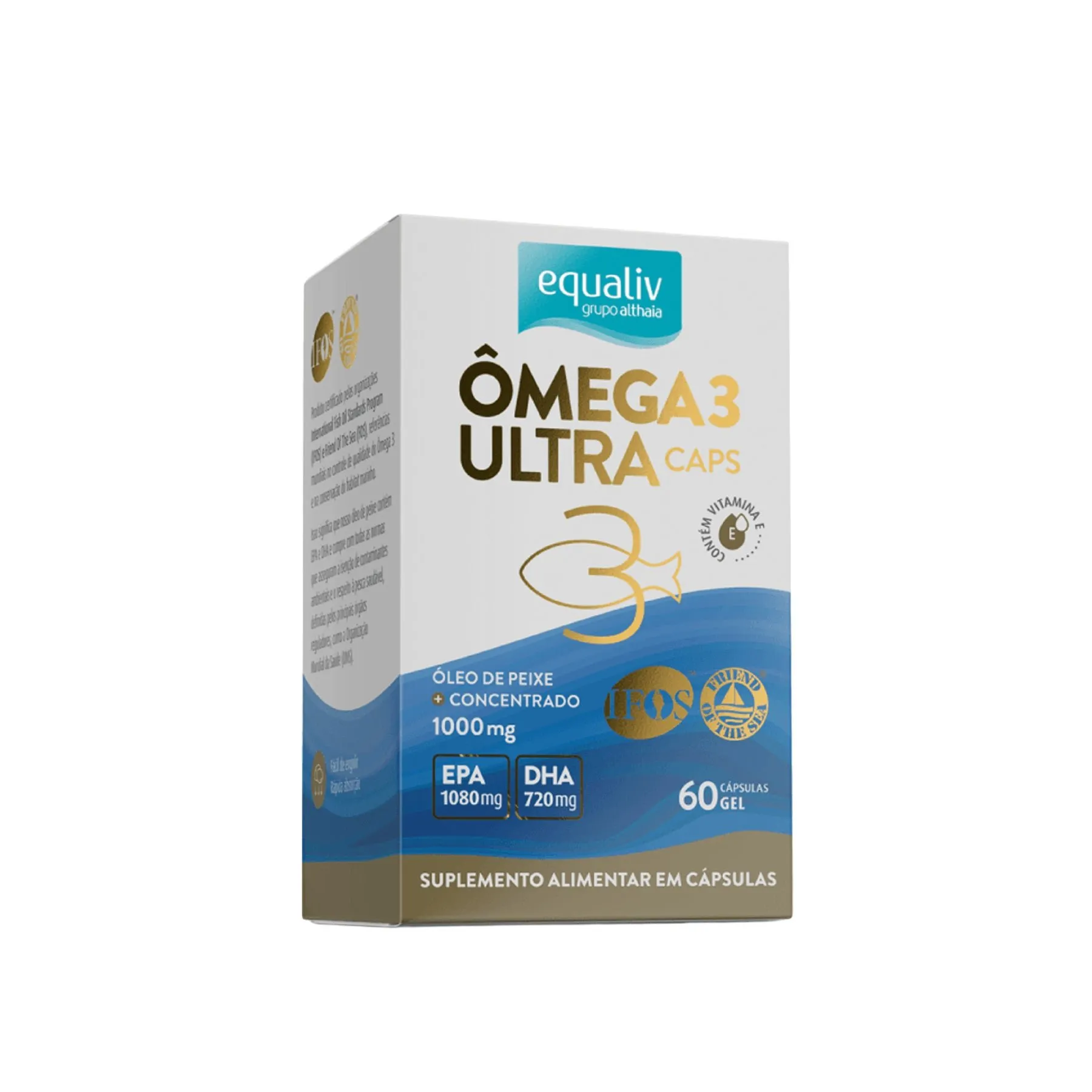 Além de mais concentrado, o Ômega 3 - Ultra Caps - EQUALIV possui as certificações Fish Oil Standards Program (IFOS) e Friend Of The Sea (FOS), referências mundiais no controle de qualidade do ômega 3 e na conservação do habitat marinho. Isso significa que o nosso produto cumpre com todas as normas que asseguram a isenção de contaminantes ambientais e o respeito à pesca saudável, definidas pelos principais órgãos reguladores, dentre eles a Organização Mundial da Saúde (OMS).