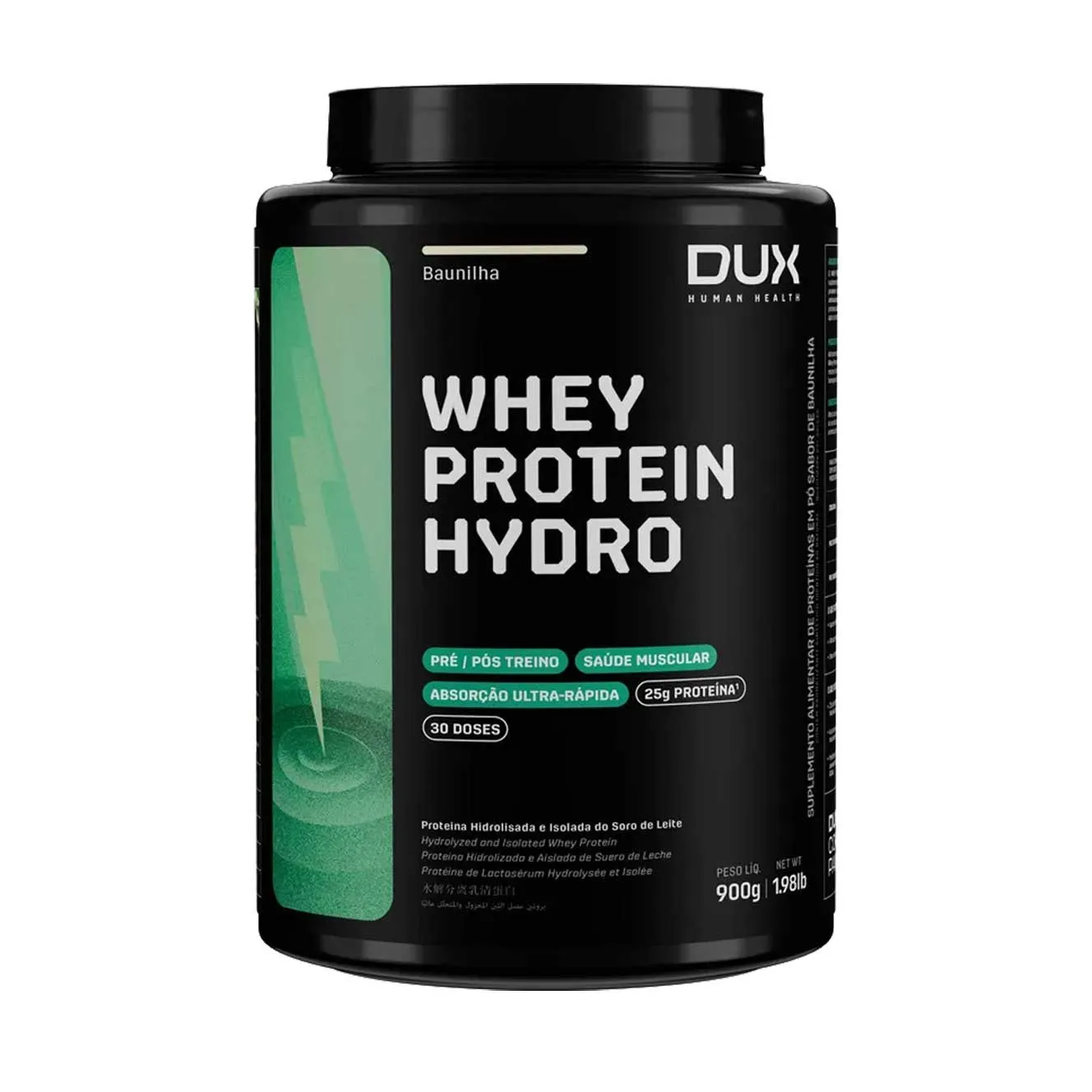Whey Protein HYDRO - DUX Nosso Whey Protein Hidrolisado, é uma proteína extraída do soro do leite e submetida a um processo adicional de hidrólise que quebra a proteína em partes menores, o que ajuda na digestão e torna a absorção mais rápida. Oferece 25g de proteína hidrolisada e isolada por dose, com baixo teor de carboidratos e gordura. Com um perfil nutricional completo e fórmula balanceada, fornece suporte energético equilibrado e uma recuperação mais eficaz, tornando-a uma excelente escolha para consumo antes e depois dos treinos.
